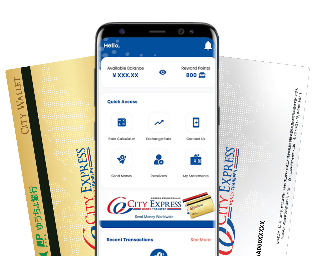 City Express Money Transfer is a licensed and regulated remittance service in Japan, offering a fast, secure, and affordable way to send money worldwide. With the best exchange rates and low service fees, our trusted platform ensures your transfers are safe, seamless, and hassle-free.
